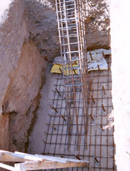 Second problem was to develop an effective system to resist horizontal thrust transferred by the arch at its support. As foundation with good quality rock was available on site, rock anchors in shear were used to provide horizontal reaction of the foundation.