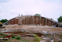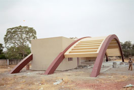 Slab with secondary beams has been provided to cover the stage as well as the rooms. But the main system supporting the whole structure is composed of three large span arches which covers almost 50 m x 11 m column free area. Arch being a compressive element; full utilization of compressive strength of concrete has been achieved.